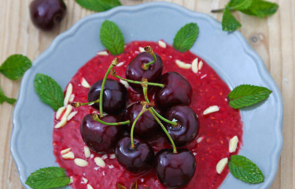 Usiamo le ciliegie per un semplice dessert abbinandole a una profumata salsa di lamponi aromatizzati al limone, esaltando il dolcetto con menta fresca e scagliette di cioccolato bianco.