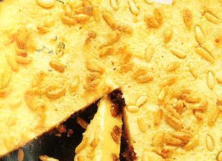 Torta scannellata di frolla all’arancia e mandorle con crema di mais all’ameretto