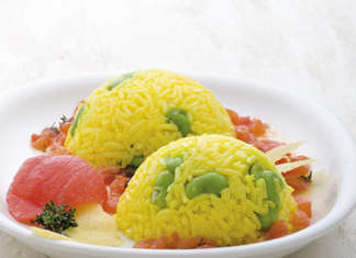 Padellata di tempeh, fave e asparagi con salsa alla curcuma