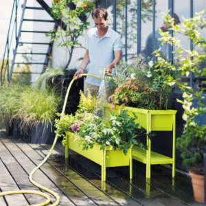 Aukland è una grande fioriera comoda, che vi permette di coltivare senza piegare la schiena. È larga circa 1 metro, abbastanza piccola da trovare posto un po’ dappertutto, ma larga a sufficienza per ospitare, per esempio, 4 piante di pomodori intervallate da basilico e fiori benefici come il ricadente nasturzio. Sotto potete mettere piante da ombra insieme agli attrezzi da giardinaggio. La spalliera può servire per rampicanti o per appendere altri vasi, facendone una parete verde in continua evoluzione. È in metallo nero da esterno ed è venduta insieme ai 4 vasi appesi. La trovate da Maison Du Monde a un prezzo di circa 219 euro.