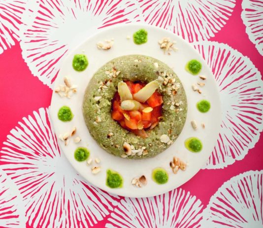 5 ricette con gli sparagi: Sfoglie di pistacchio con ripieno di asparagi alla maggiorana - Sformati primaverili di asparagi e tarassaco - Ciambella di quinoa al pesto con salsa di asparagi bianchi al limone - Crespelle integrali con asparagi bianchi e ortiche ai semi di papavero - Insalata tiepida con doppi asparagi, cicorino e crostini integrali
