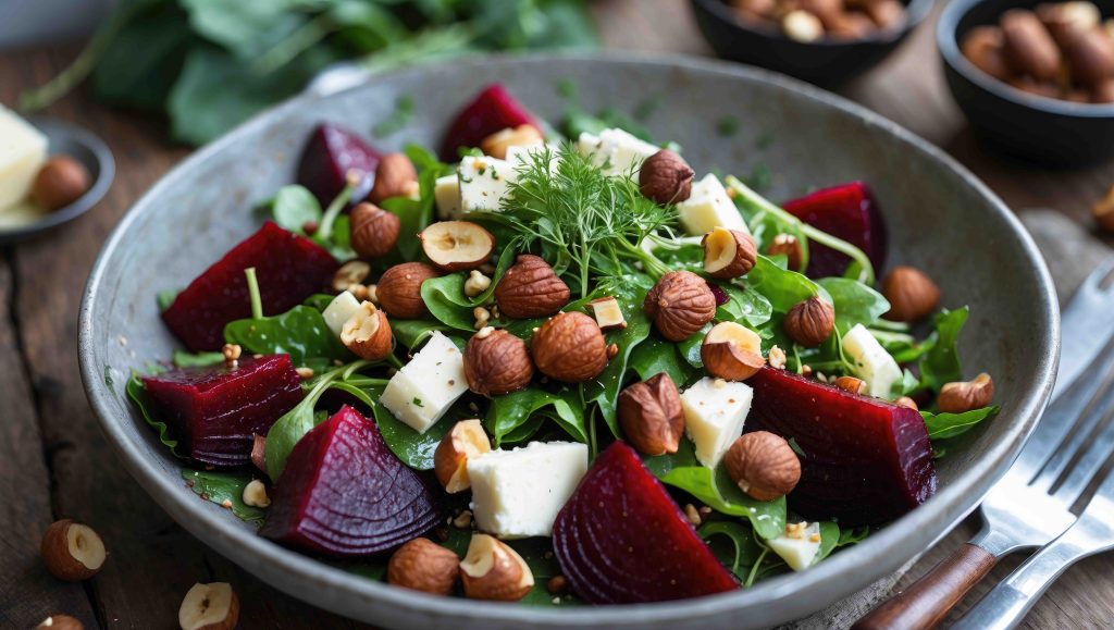 Le nocciole sono perfette per completare le insalate di ortaggi e frutta fresca. Provate ad associare un’insalata amarognola - come rucola, scarola o un radicchio - con la dolce uva bianca e una bella manciata di nocciole tostate intere, scaglie di formaggio stagionato e un olio extravergine intensamente fruttato. Oppure aggiungete delle nocciole tostate tritate grossolanamente a un'insalata fatta con cubetti di pera cruda e di barbabietola cotta al forno, lattuga e un trito di erba cipollina o, ancora meglio, della parte più tenera di un piccolo porro. Infine, riducete in striscioline del cavolo nero crudo, conditelo con succo d'arancia, olio, sale, pepe e, dopo una breve marinatura, unite nocciole tostate a pezzi e spicchi d'arancia pelati al vivo.