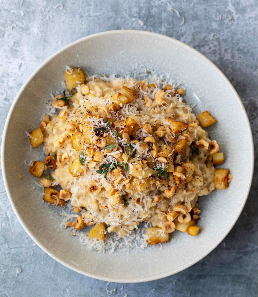 Riso e nocciole sono un abbinamento classico che dà sempre ottimi risultati, a partire dal risotto. Come base potete preparare un risotto allo zafferano o con la verdura che preferite, mantecandolo però alla fine con una combinazione di formaggio aromatico (come il castelmagno) e nocciole tostate al posto del tradizionale burro. Cambiamo riso: quello basmati in genere accompagna da solo le verdure, invece di tenerlo separato provate a mescolarlo con cavolo nero cotto, nocciole, maggiorana e aromatizzate il tutto con una grattugiata di scorza di arancia. Infine, condite l’ottimo riso integrale (anche rosso o nero) con finocchi trifolati in padella e poi frullati, qualche nocciola tostata e una generosa.