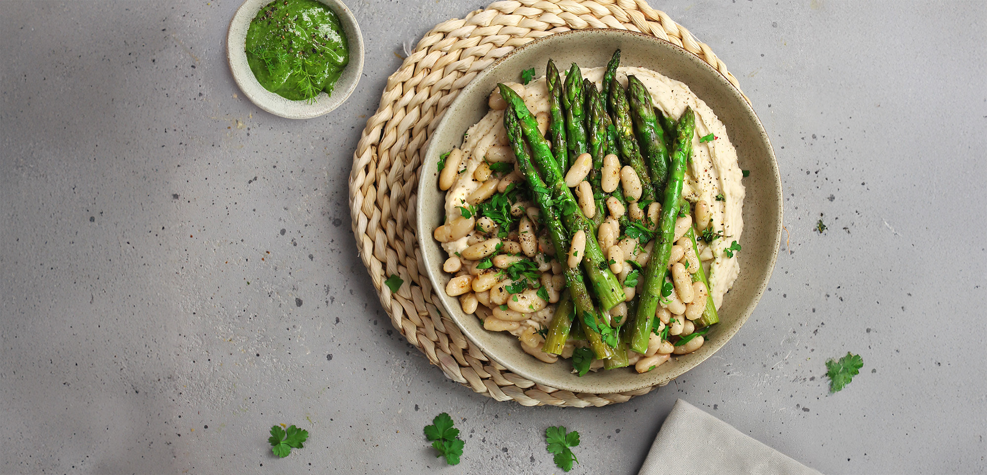 Sfogliate qualche rametto di maggiorana e prezzemolo, poi tritatene grossolanamente le foglie. Mettete le erbe in un mixer insieme con anacardi non salati e qualche cucchiaio d’olio, quindi frullate fino a ottenere una salsa densa da aggiustare di sale. Cuocete sulla piastra per qualche minuto degli asparagi bianchi, irrorateli con la salsa e servite.