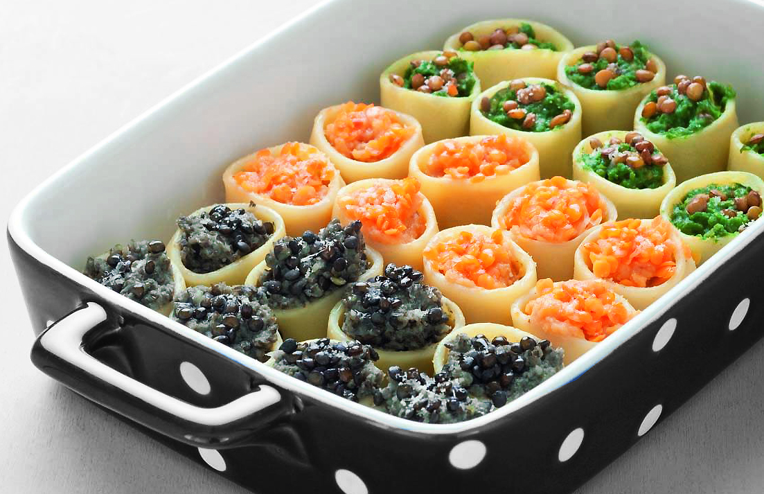 5 ricette con le lenticchie: Burger di lenticchie - Calamarata colorata alle 3 lenticchie - Involtini di pasta fillo con carote e lenticchie in salsa aromatica - Strudel di lenticchie con sedano rapa e verza - Zuppa di lenticchie rosse