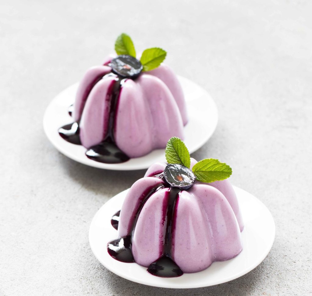 7. Sformate le bavaresi nei piatti, colatevi sopra in modo decorativo la salsa densa di mirtilli e completate con qualche foglia di menta.
