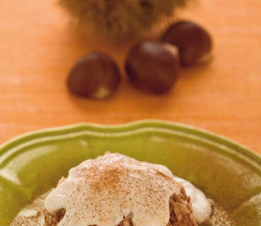 5 ricette con le castagne: Fusilli di kamut in salsa di castagne e funghi porcini - Millefoglie di crespelle con castagne e funghi di bosco - Zuppa di castagne, cannellini, farro e funghi - Mont Blanc leggero alla ricotta - Pudding di marroni con crema al cioccolato