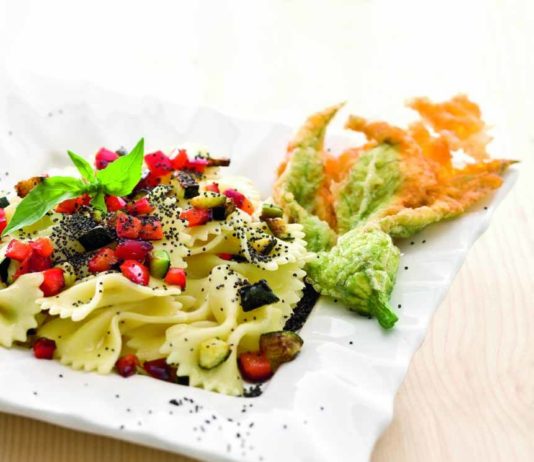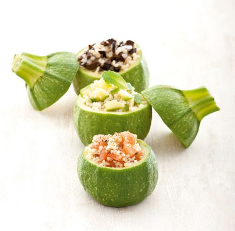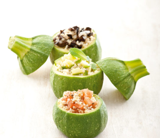 5 ricette con le zucchine: Antipasto di zucchine con crema di ceci e pomodori alla maggiorana - Zucchine tonde ripiene di bulgur ai 3 colori - Falafel di ceci e zucchine con maionese al coriandolo - Farfalle con ortaggi colorati, semi di papavero e fiori di zucca - Millefoglie di zucchine e formaggio