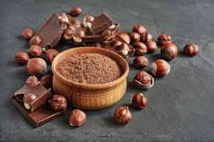 2 Tritate le nocciole, lasciandone alcune intere, e miscelatele con i tre tipi di fiocchi. Versatevi sopra il composto al cacao precedentemente preparato e mescolate con cura.