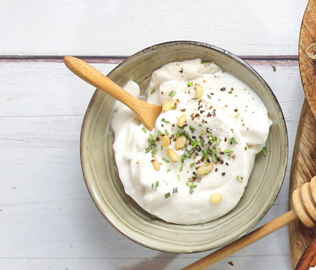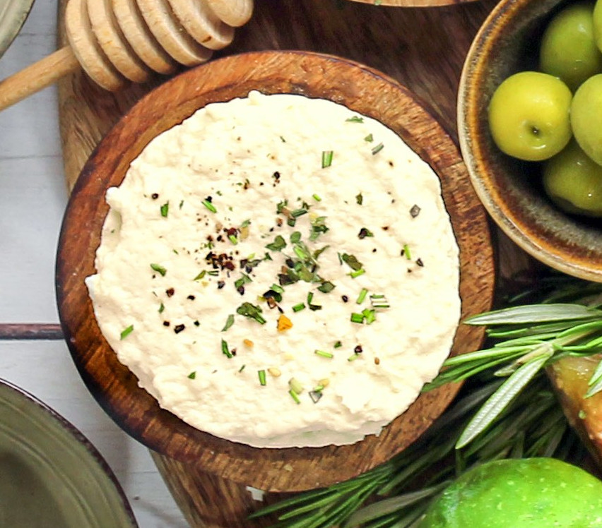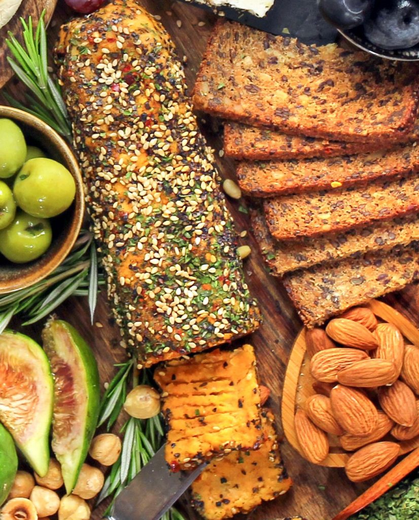 Dosi per 8 fette: 200 g di anacardi non tostati (si trovano nei negozi di alimentazione naturale o in quelli orientali), 2-4 di cucchiai di bevanda vegetale non zuccherata, 2 cucchiai di succo di limone, lievito alimentare in scaglie (facoltativo), sale; sesamo, erbe, spezie o altro a scelta per decorare.