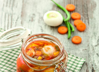 5 ricette sotto vetro: Zucchine in agrodolce al profumo di menta – Giardiniera ricca alla piemontese – Macedonia di frutta estiva in sciroppo di malto – Confettura di pesche bianche al rosmarino – Peperoni sottolio con capperi e acciughe