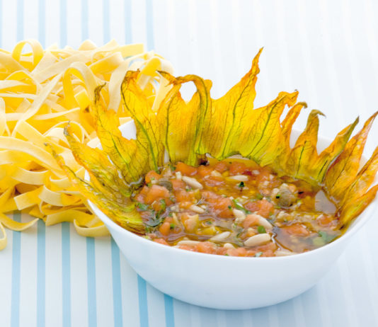 5 ricette vegetariane: Sugo saporito di pomodori con pinoli, olive e fiori di zucca tostati - Crema a strati di melanzane, cipolle e avocado - Marinata ai tre peperoni con olive al forno - Noodles al pesto caipiroska - Crema vegan di tofu e olive