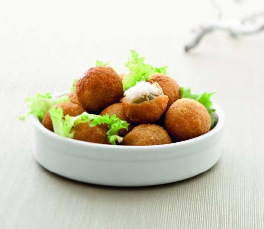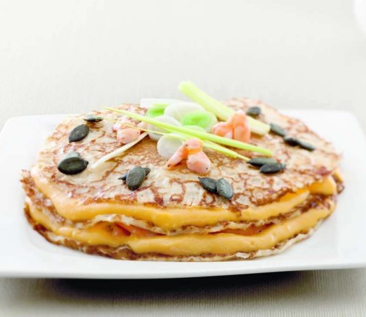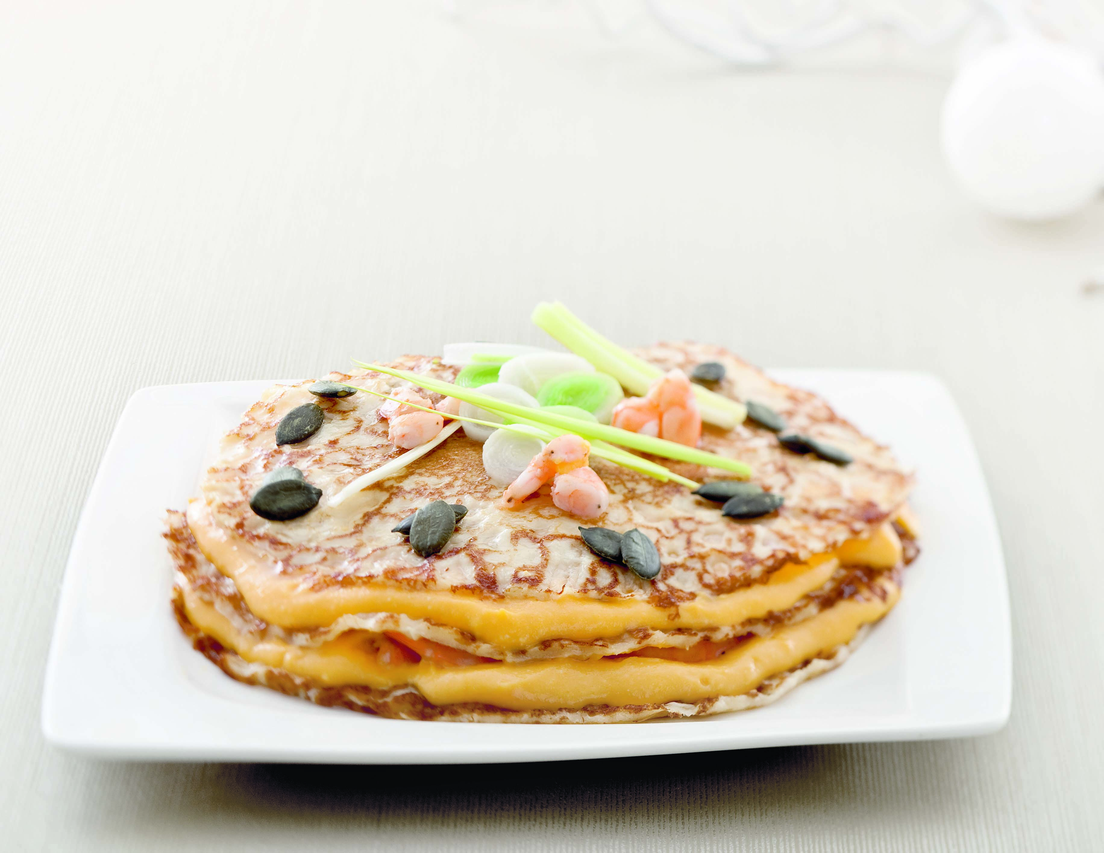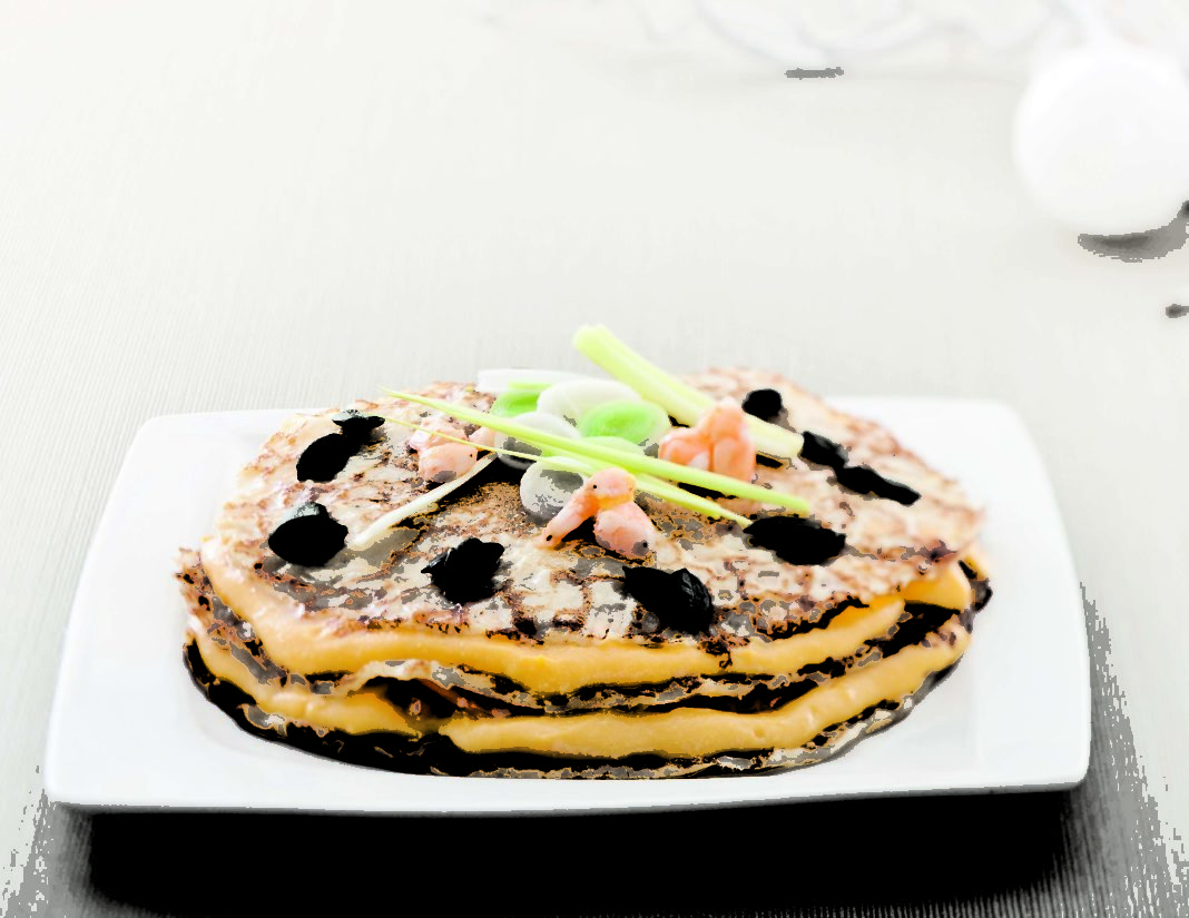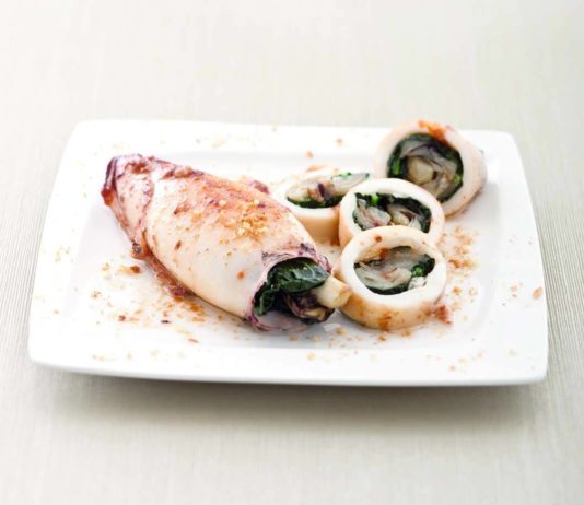 5 ricette con il pesce: Millefoglie con gamberi e crema di zucca allo zenzero - Olive farcite con gamberi e cernia - Calamari ripieni con ortaggi invernali -Seppioline con crema di broccoli al limone - Crocchette di patate e baccalà con crema di ceci