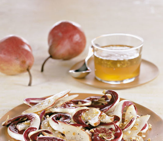 5 ricette con il radicchio rosso: Insalata di radicchio e pera - Lasagnette colorate con radicchio, ricotta e mandorle - Penne integrali in crema di radicchio - Ravioli al radicchio rosso e noci in crema di taleggio - Risotto alle lenticchie rosse con topinambur e radicchio