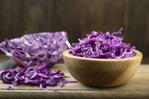 Per 2-4 uova: 500 g cavolo cappuccio rosso, 2 uova, 1 cucchiaio di aceto di mele, 1 cucchiaio di sale grosso, fiorellini e foglie secchi, un collant.