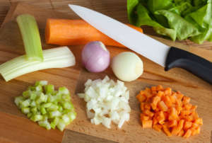1 Tagliate le verdure in piccoli dadini regolari, tranne i pomodori. Sbollentate questi ultimi tre minuti in acqua e poi raffreddateli, in modo da privarli della pellicina esterna, quindi tagliateli a dadini.