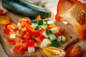 Ingredienti per due vasetti da 300 g: 300 g di zucchine, 200 g di peperoni, 100 g di cipolle rosse, 400 g di pomodori maturi, 4 spicchi d’aglio, 1 manciata di erbe aromatiche fresche (timo, rosmarino, basilico), 1 limone, olio e.v. d’oliva