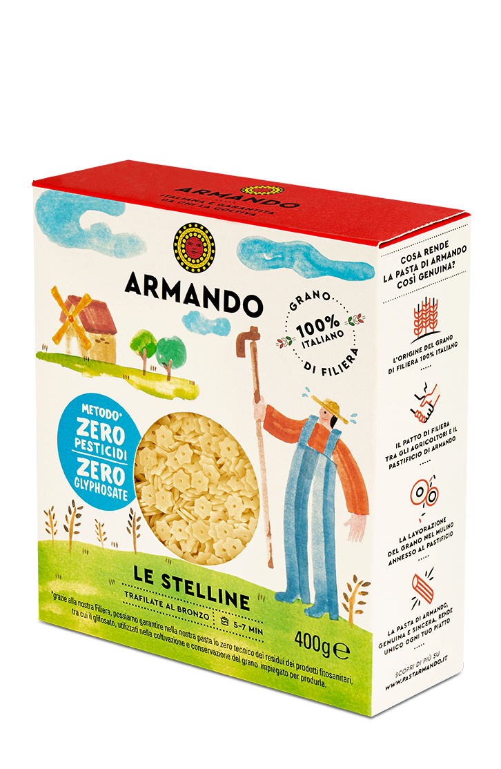 Sono cinque le referenze della nuova linea di pastine di Armando: le Stelline, gli Orzi, i Ditali, l'Alfabeto, la Pasta Zoo. Le ultime due in particolare sono state pensate per incuriosire i bambini, ma ogni confezione di pastina è illustrata con la storia della filiera Armando.