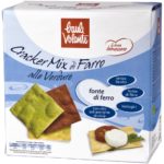 Un variopinto mix di cracker di farro, senza lievito, di tre diversi gusti: rossi alla barbabietola, verdi con spinaci, naturali alle carote