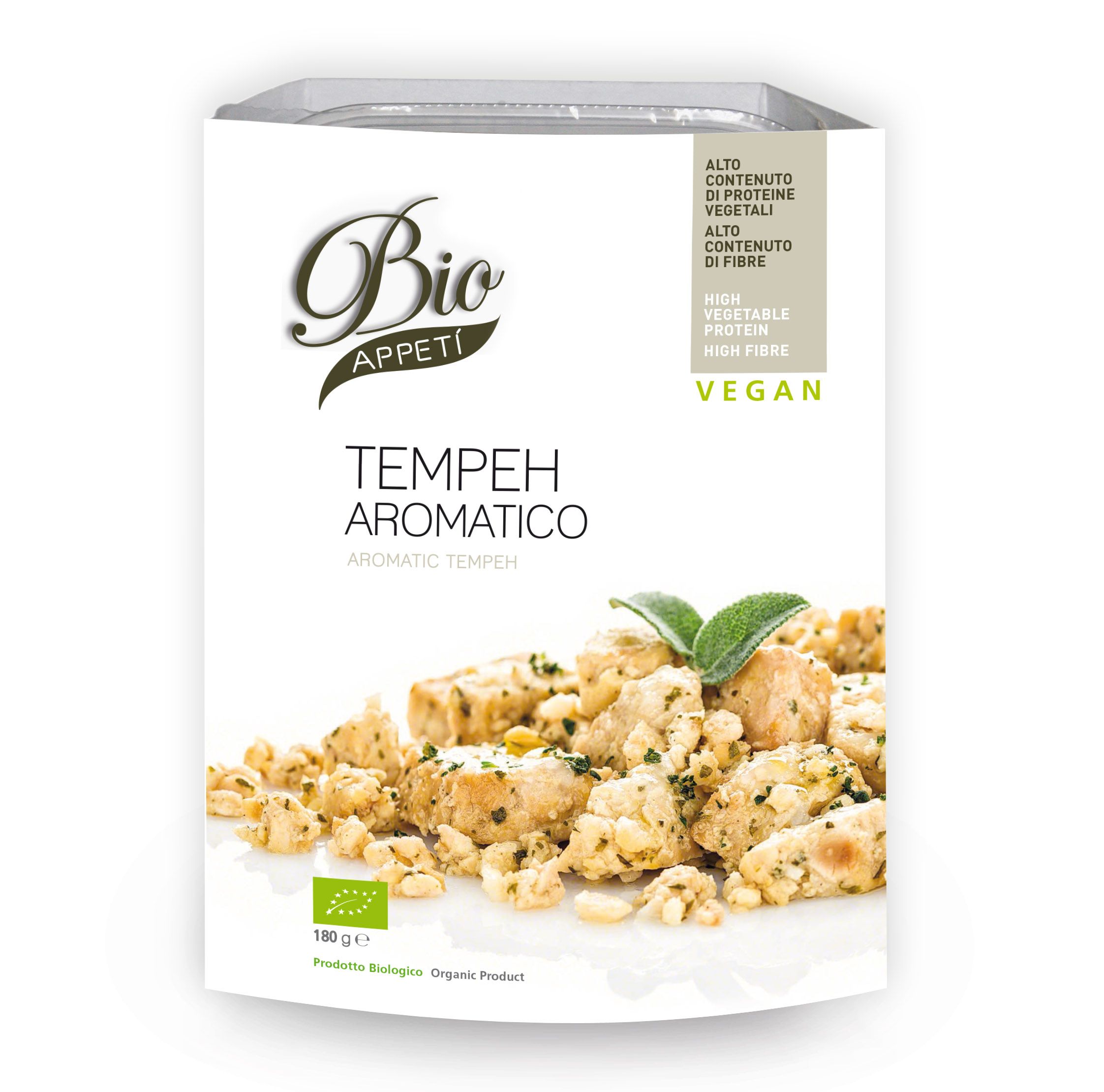 Disponibile finora come proteina vegetale al naturale o alla piastra, il tempeh, alimento ricco di fibre e proteine vegetali derivato dalla fermentazione di soia gialla bio di provenienza italiana, diventa protagonista di un piatto pronto disponibile in una comoda vaschetta da 180g. Ricco e profumato, grazie ad un mix bilanciato di cipolla, mandorle, limone, prezzemolo, il Tempeh Aromatico BioAppetì è un gustoso secondo piatto o una saporita farcitura già pronta per delle sfiziose piadine o panini vegetali.