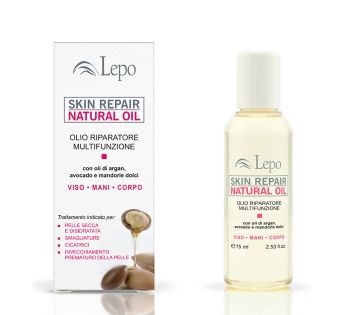 Lepo Skin Repair Natural Oil è un trattamento viso, mani e corpo indicato per la pelle secca e disidratata, per le smagliature, le cicatrici e in caso di invecchiamento cutaneo. E' composto da una miscela di oli naturali (di argan, avocado e mandorle dolci), estratti di piante e vitamine che favoriscono i processi di riparazione e rigenerazione dell'epidermide, contrastandone tutti i principali inestetismi, attenuando cicatrici, macchie e arrossamenti, prevenendo smagliature e invecchiamento.