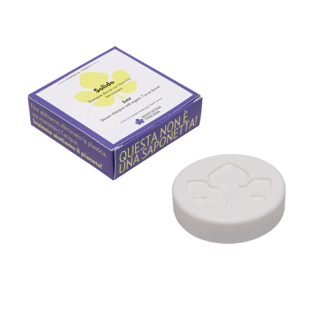 Solido è un prodotto che prende il nome dalla sua consistenza. Il suo aspetto, infatti, è quello di una saponetta, ma in realtà è un detergente per il corpo e per i capelli. È formulato, senza processo di saponificazione, come un vero e proprio detergente liquido, ma senza acqua, combinando delicati tensioattivi di origine vegetale a estratto di finocchio bio toscano, proveniente dall’Azienda agricola Il Ramerino.