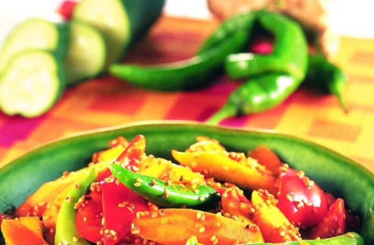 - Pulite le carote, il peperone rosso, i cetrioli e riducete a listarelle i primi due e a dadini i cetrioli. Metteteli nella padella sul fuoco, aggiungete i peperoni verdi lunghi, sempre ridotti in striscioline. Cuocete il tutto per due minuti a fuoco vivo.