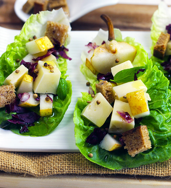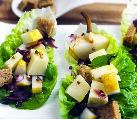 Le barchette di lattuga con pera e formaggio sono un antipasto autunnale veloce e senza glutine.