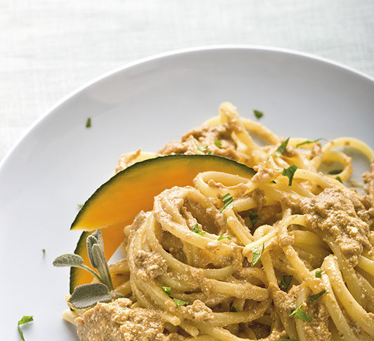 - Frullate finemente la salsa di zucca, mescolatela con il prezzemolo tritato e conditeci le bavette appena scolate. Decorate la pasta con le altre foglie di salvia fresca e servite.