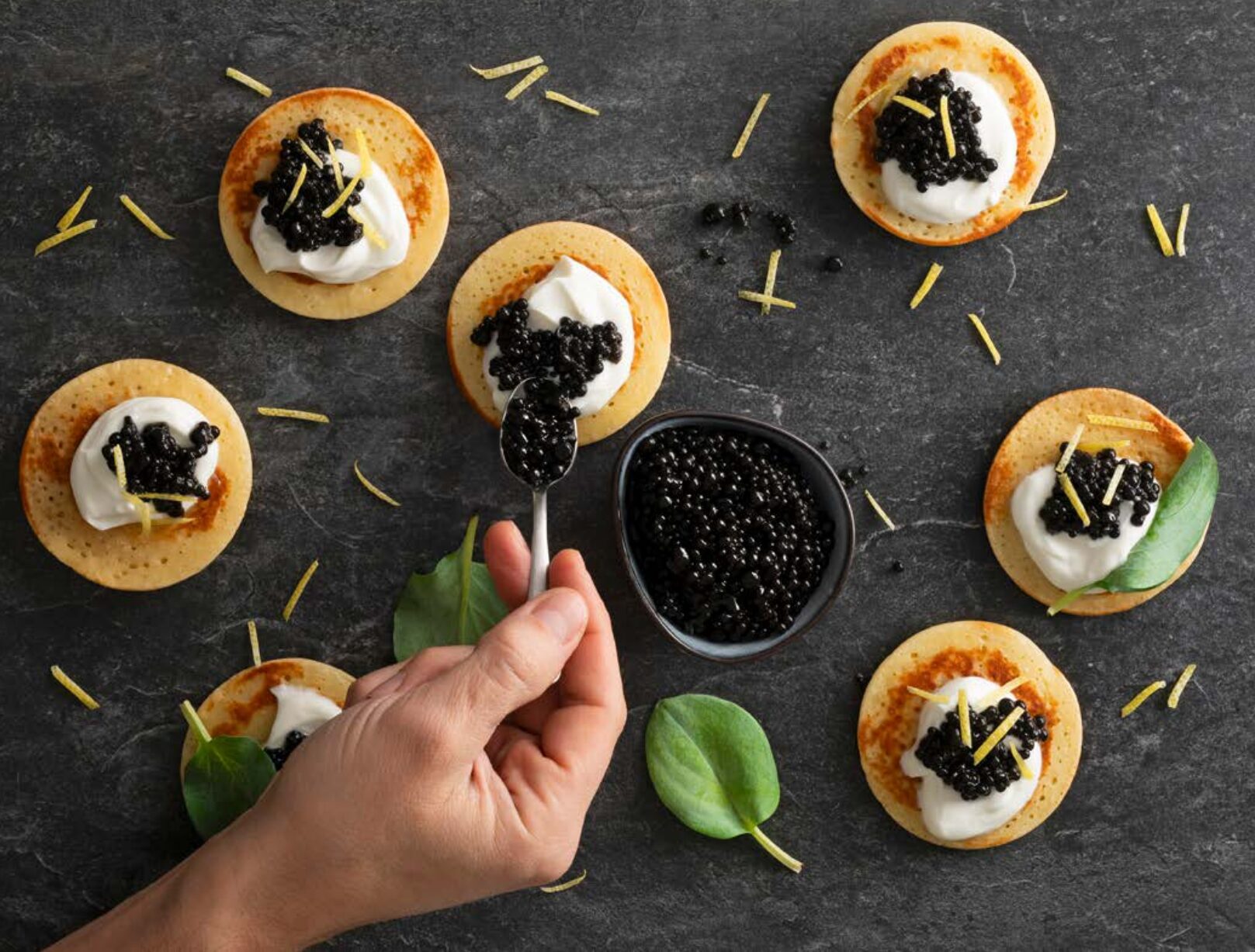 - 7. Servite i blinis caldi completandoli con la panna acida, il caviale di olive, scorzette di limone e qualche foglia di ostrica vegetale.