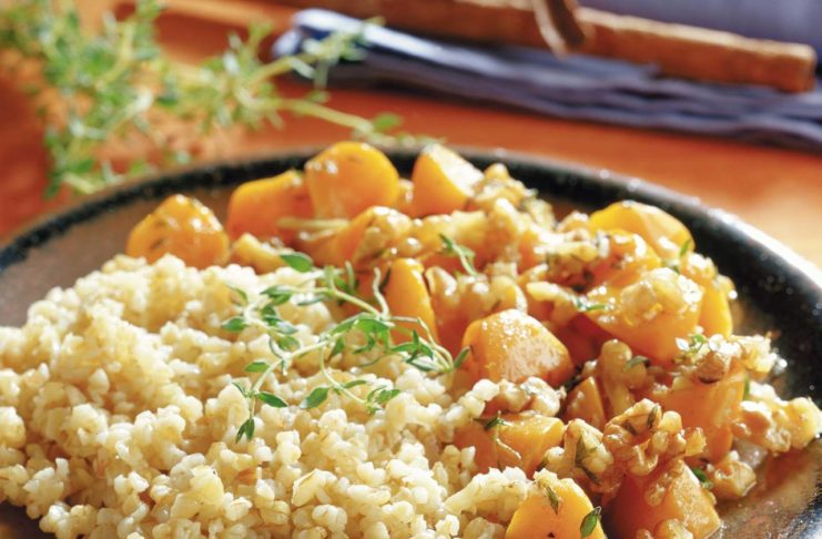 - Controllate la cottura delle carote accertandovi che rimangano leggermente croccanti e con un po' di liquido di cottura. Poco prima di spegnere aggiungete il succo di limone e la scorza grattugiata rimasta, le noci, 1 pizzico di cannella. Servite il bulgur e le carote separatamente, ben caldi, con buon olio da aggiungere a piacere ed eventualmente un pizzico di peperoncino