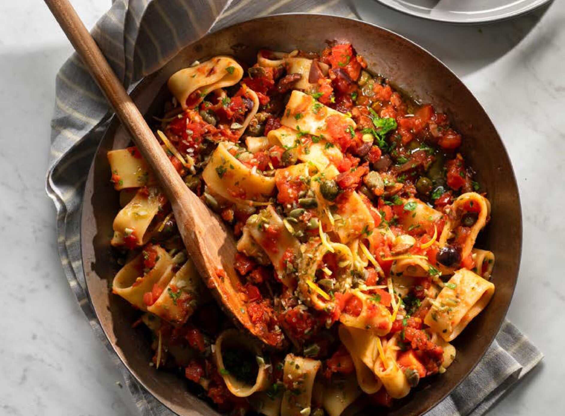 - Completate all’ultimo la calamarata con il rimanente prezzemolo, le olive, la scorza di limone e il trito di alghe e semi di zucca. Distribuitela nei piatti e, a scelta, spolveratela con qualche seme di zucca tritato grossolanamente.