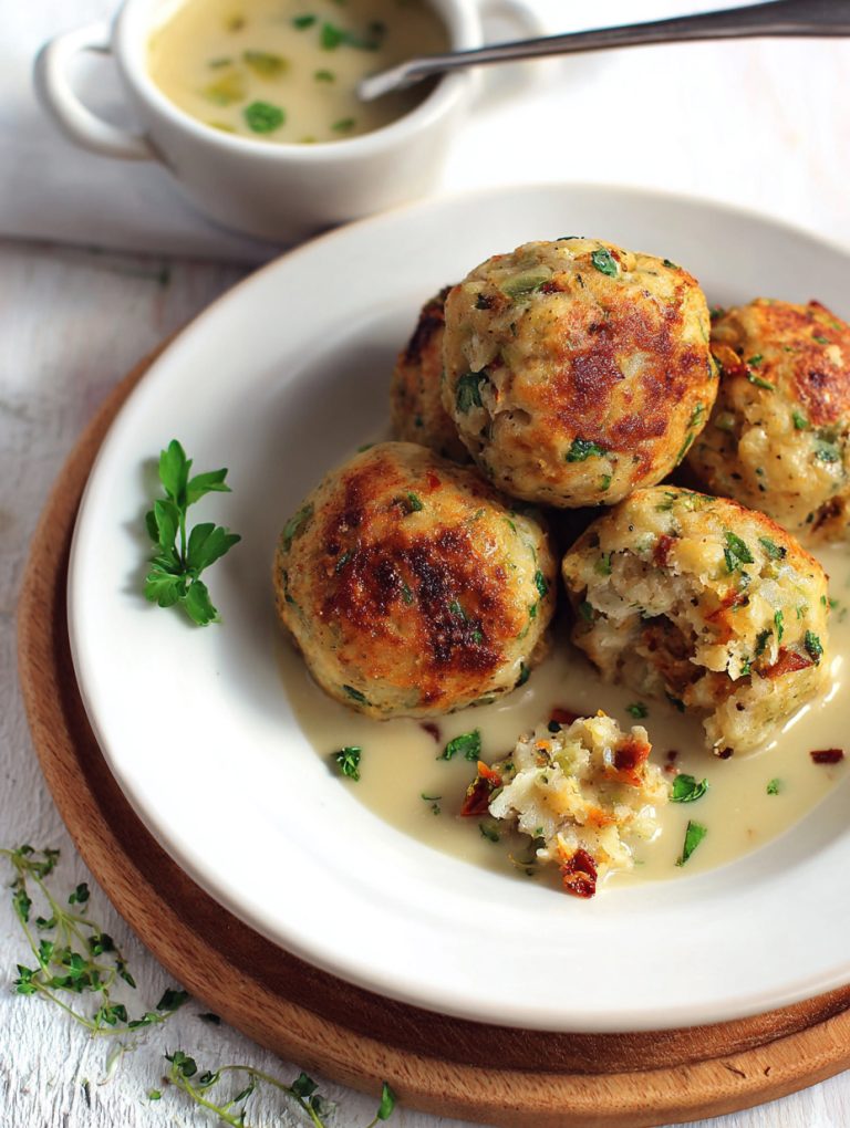 Potete gustare questi canederli in brodo, oppure con una besciamella vegan.