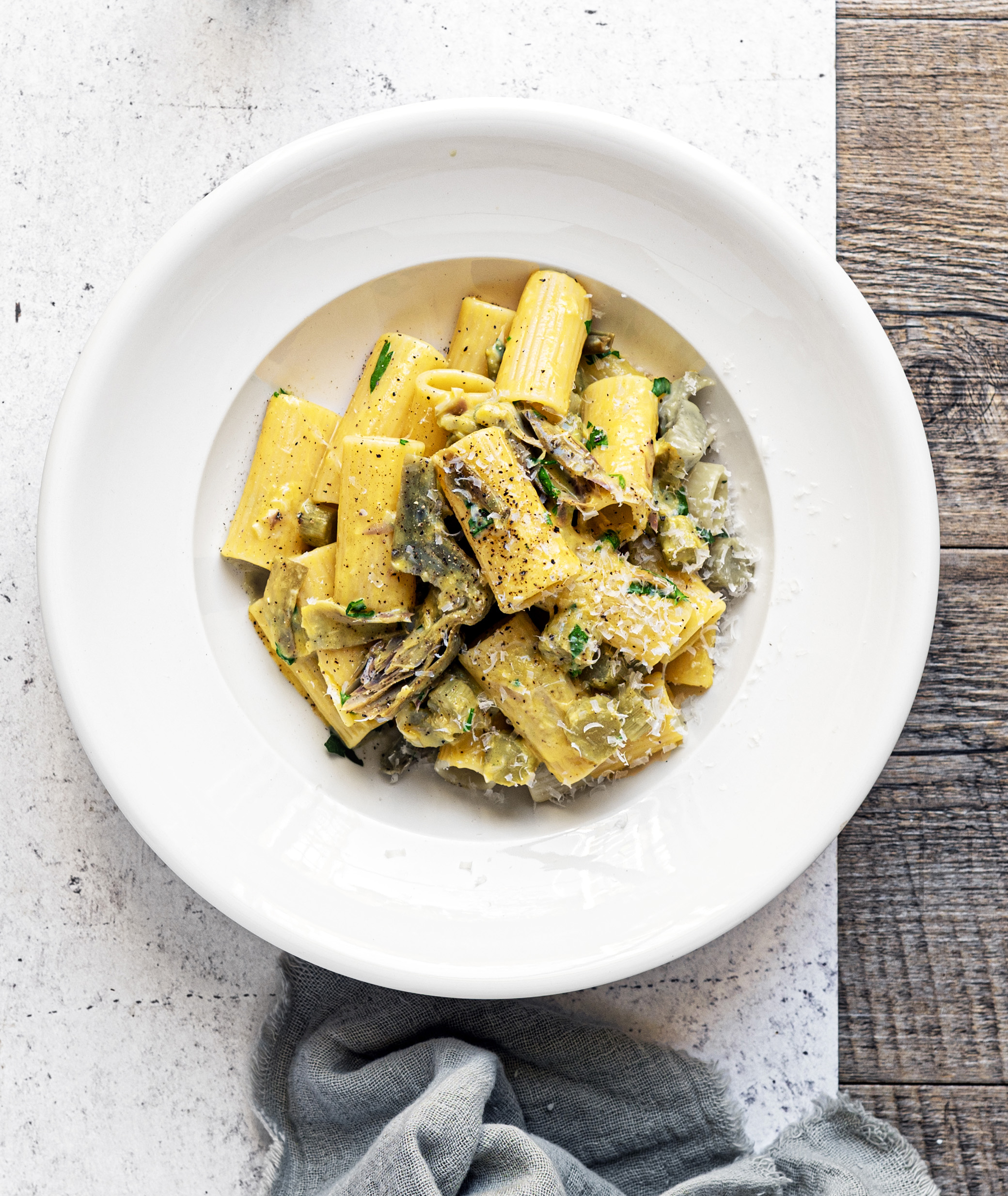 - Lessate, nel frattempo, i rigatoni in abbondante acqua salata per il tempo di cottura indicato sulla confezione. Scolateli nel tegame (conservando poca acqua di cottura) con i carciofi dopo aver eliminato l’aglio.