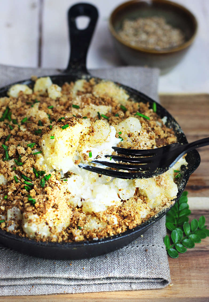 I cavolfiori cremosi in crumble croccante sono una ricetta vegetariana. Per insaporire ulteriormente il piatto potete aggiungere al crumble del parmigiano grattugiato.