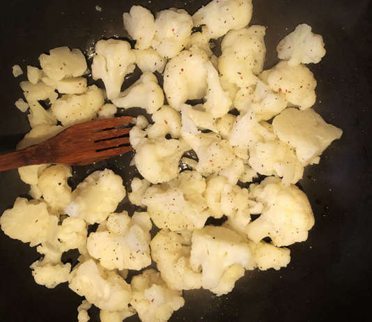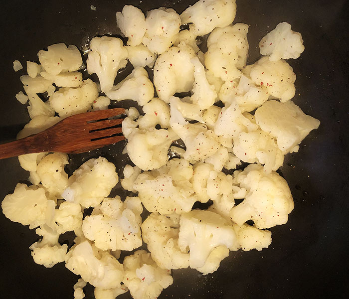 Trasferite le cimette di cavolfiore cotte ma ancora sode in una padella antiaderente capiente e rosolatele con un filo abbondante di olio. Aggiustate di sale e pepe. Quando iniziano a dorare aggiungete in padella la robiola e fate sciogliere.