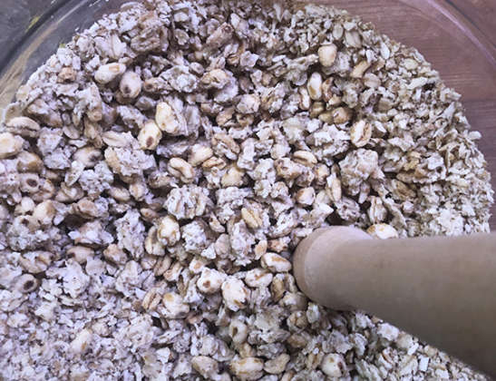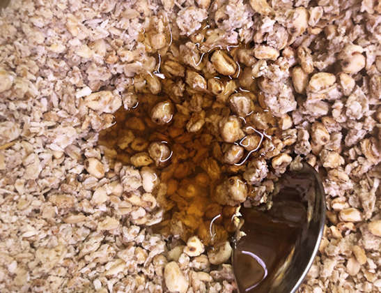 Aggiungete 45g di miele ai fiocchi di avena e mescolate molto bene con un cucchiaio di acqua.
