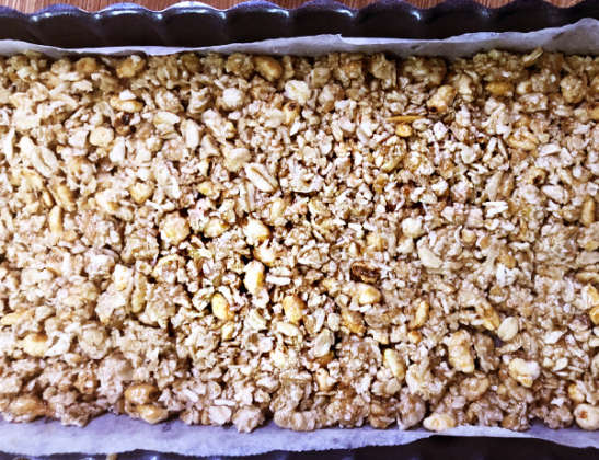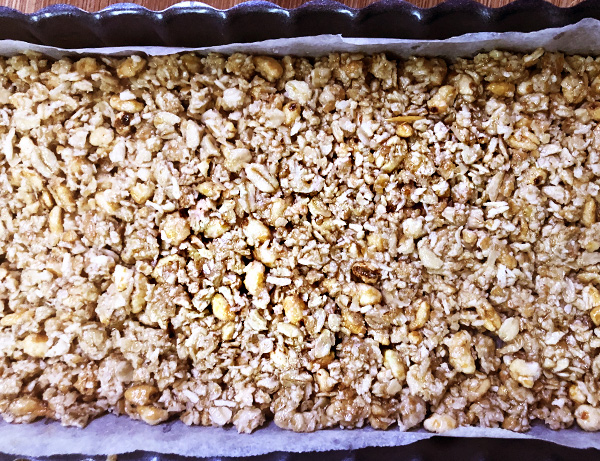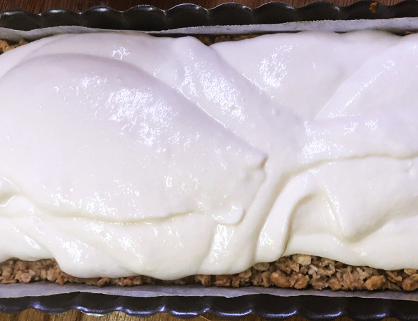 Foderate una teglia con la carta da forno e create uno strato di fiocchi di avena, schiacciandoli con il dorso di un cucchiaio per creare una base più compatta possibile. Infornate a 170° per 10 minuti.