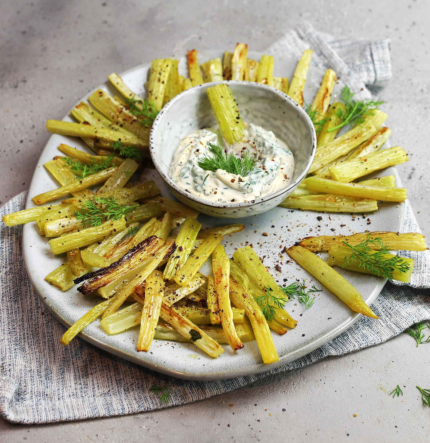 5. Accompagnate le chips di sedano ancora calde con la maionese e decorate il piatto con aneto sminuzzato. Portate subito in tavola.
