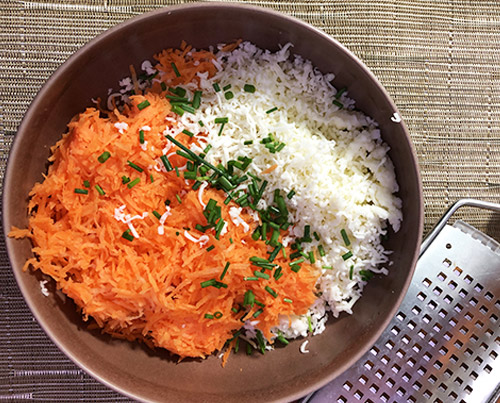 3. Riunite in una ciotola le carote grattugiate asciutte, la scamorza, il parmigiano, l'erba cipollina tagliuzzata, una presa di pangrattato, sale e pepe. Impastate con le mani e formate un composto elastico, che potrete modellare a cotoletta.