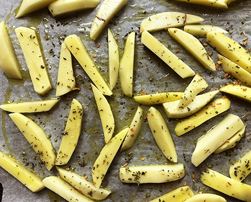 1. Se volete preparare il contorno di patate, pelate 3 patate e tagliatele grossolanamente a bastoncini. Se avete tempo tuffateli in acqua per togliere parte dell'amido, poi asciugate e disponete su una placca da forno foderata, irrorandoli di olio e sale. Mescolate bene con le mani le patate sulla placca per ungerle completamente e poi disponetele senza sovrapporle. Aggiungete le vostre spezie preferite e infornate a 180° per 20-30'. Gli ultimi 5 minuti in modalità grill.