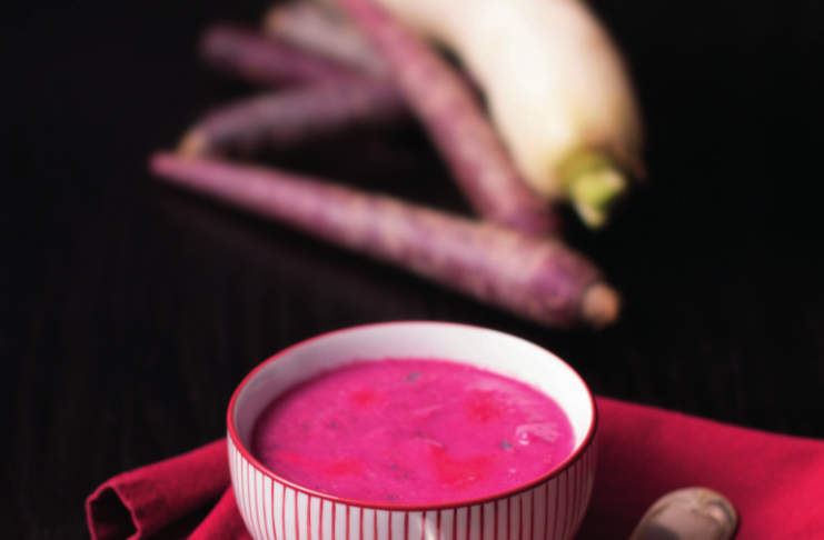 - Frullate il daikon e le carote cotte aggiungendo la polpa dell'aglio arrosto e un po' di liquido di cottura fino alla consistenza desiderata, aggiungete un paio di cucchiaini di succo di limone. Servite lasciando cadere sulla superficie della crema qualche goccia di limone e polverizzando qualche granello di sale integrale. Dove cade il limone la zuppa diventerà ancora più chiara e brillante, dove cade il sale la zuppa diventerà più scura e violacea.