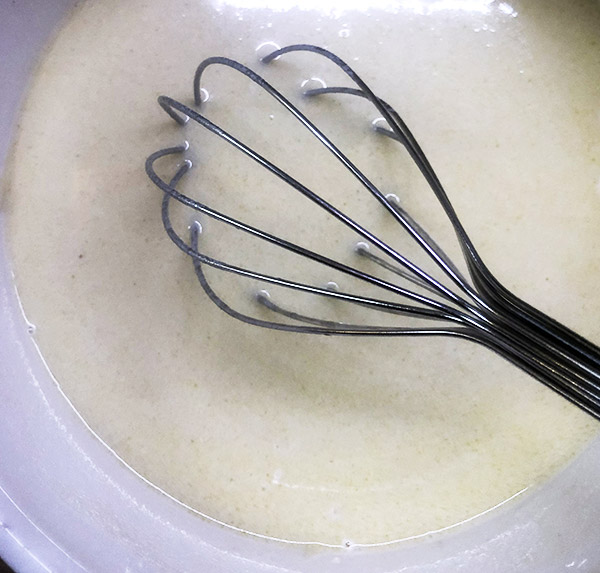 1. In un'ampia ciotola, unite 250g di farina di riso e 1 cucchiaino di sale. Mescolate. Versate 50 ml di olio e 400 ml di latte intero. Amalgamate bene con un frustino e lasciate riposare qualche minuto. Se avete tempo lasciate riposare mezz'ora.