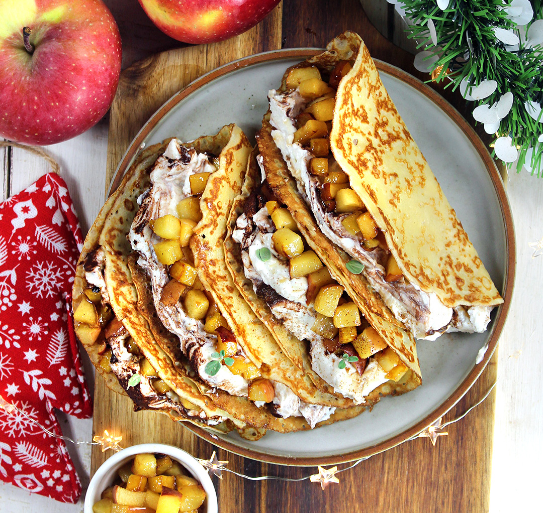 Per la variante invernale, abbiamo creato una crema mescolando la ricotta con il miele, finchè trovata la dolcezza ideale. In seguito abbiamo ridotto una mela a dadini e fatta caramellare in padella con miele e una noce di burro. Finito di farcire le crepes con la crema e i dadini di mela dolci, abbiamo spolverato con cacao amaro.