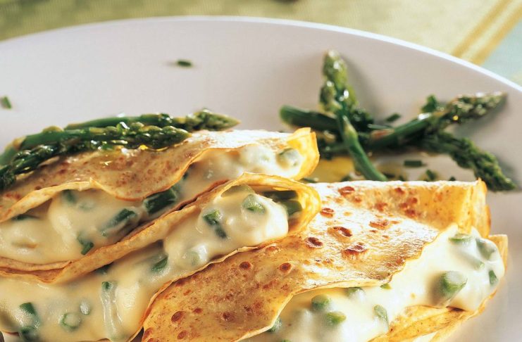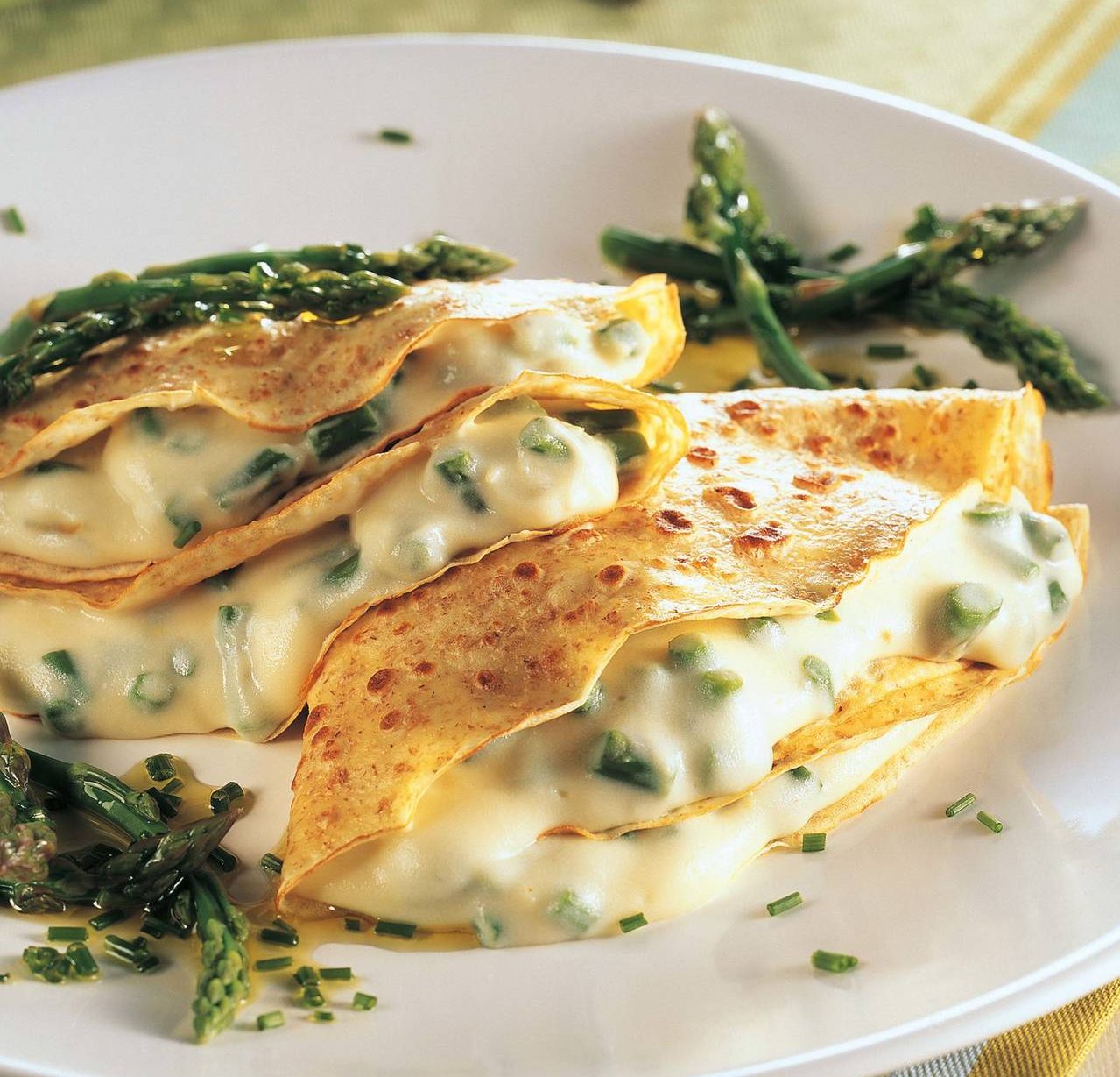 - Nel frattempo preparare l'erba cipollina e mescolarla con 2-3 cucchiai d'olio d'oliva e un pizzico di sale, distribuire le crespelle nei piatti, decorarle con le punte di asparagi e bagnarle con l'olio all'erba cipollina