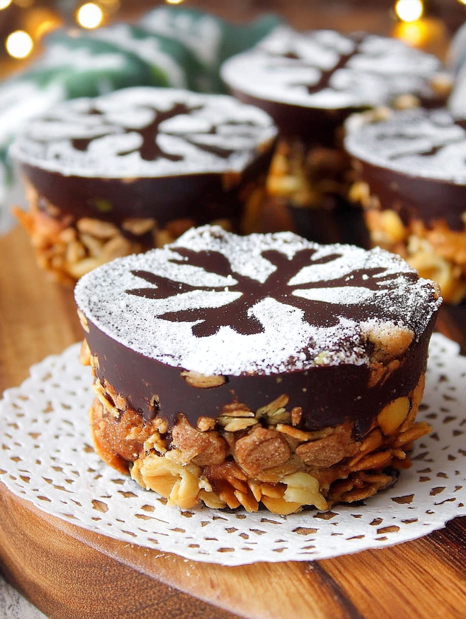 I cupcakes vegan di muesli e cioccolato sono un dolcetto senza cottura. Facilissimo e perfetto per la colazione, potete decorarlo in modo invernale con un po' di zucchero a velo e presentarne uno in ogni piatto.
