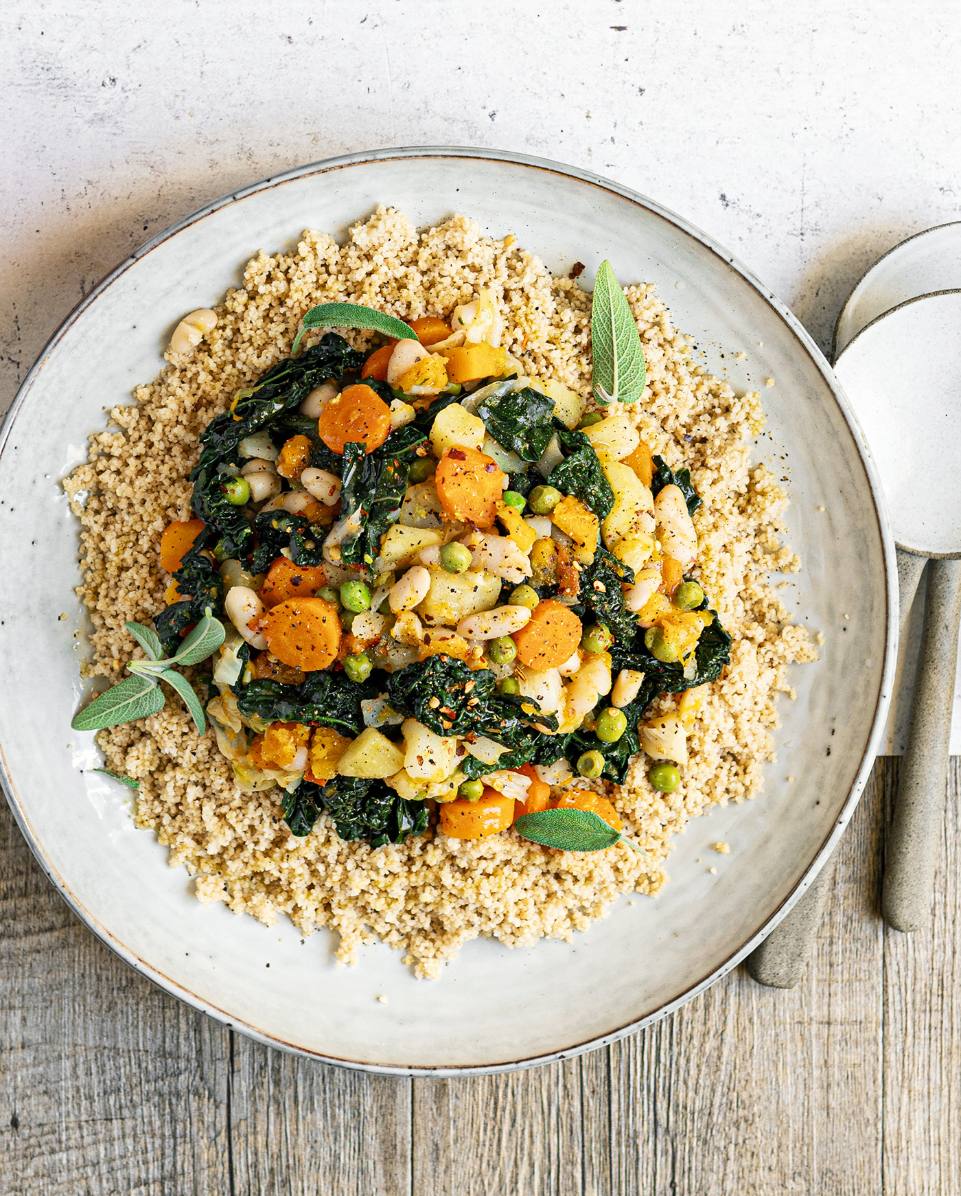 - Trasferite il cuscus in un piatto grande e ricopritelo con lo stufato di verdure. Completate con un giro d’olio, una spolveratina di pepe e di peperoncino, infine decorate con le restanti foglioline di salvia.
