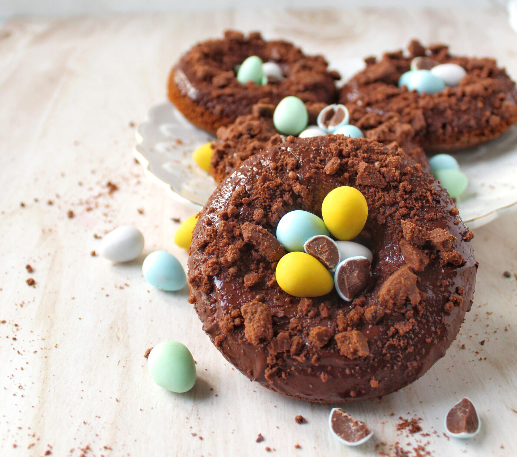 - Fate fondere a bagnomaria il cioccolato e versatelo in una ciotola. Estraete delicatamente le ciambelline dagli stampi e immergetene la parte superiore nel cioccolato fuso. Cospargetele con i biscotti tritati grossolanamente, o con la granella, e completate la decorazione con ovetti di cioccolato colorati. A scelta, potete accompagnare le ciambelline con una crema: nel box sotto ne trovate una pasticcera senza glutine.