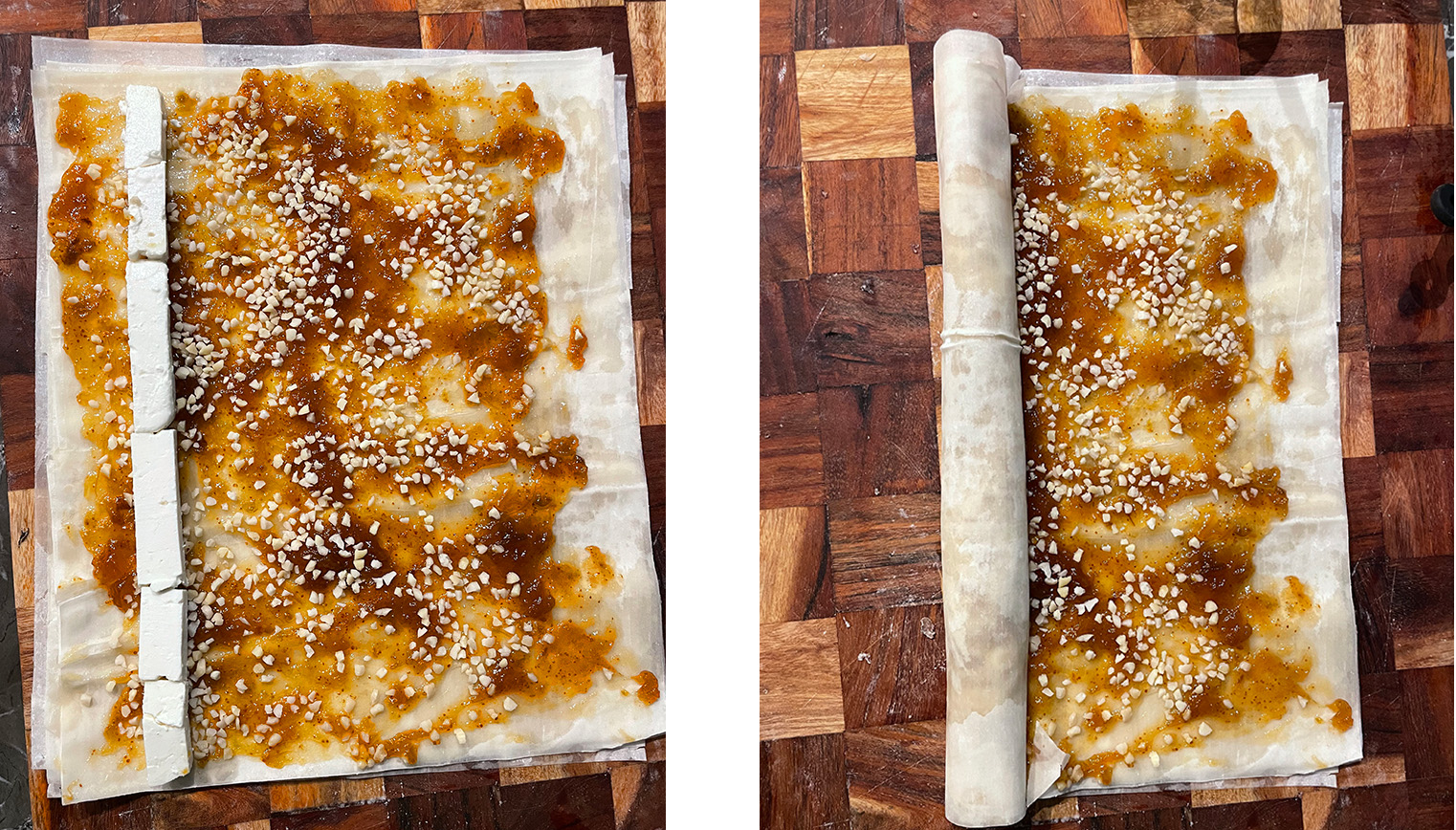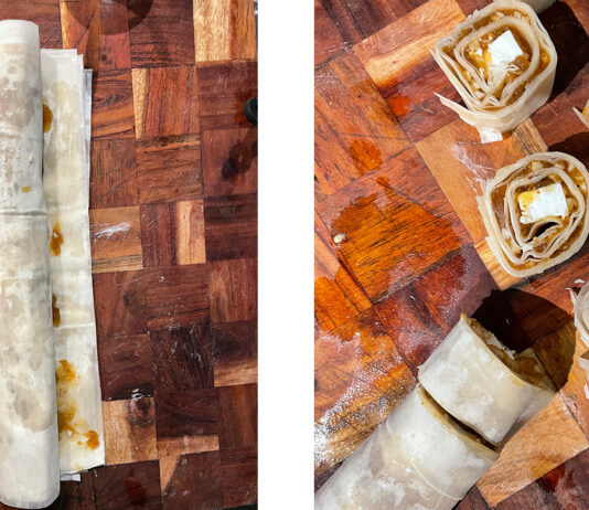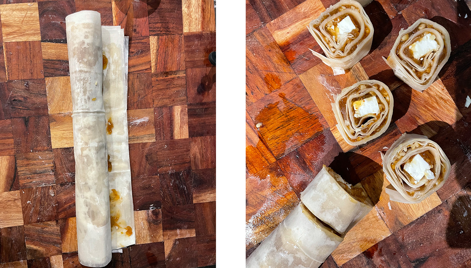 3. Arrotolate ora la pasta fillo sopra i bastoncini allineati di feta continuando ad arrotolare fino a chiudere il rotolo. Dividetelo in trancetti alti 3-4 cm e sistemateli in una teglia per muffin: in questo modo manterranno meglio la forma. In alternativa potete anche sistemarli nella leccarda del forno lasciando poco spazio tra l’uno e l’altro.