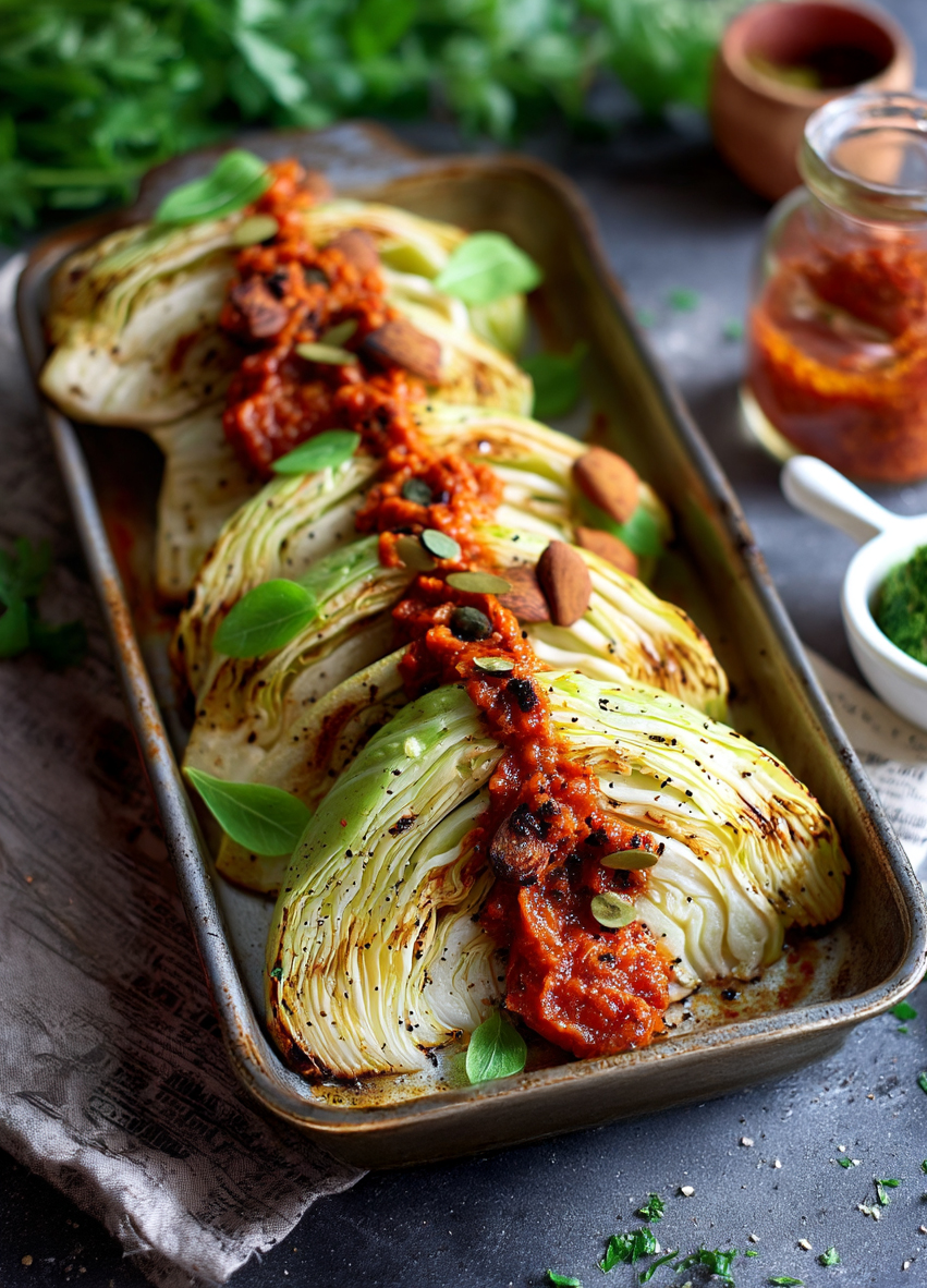 Disponete le fette di cavolo cappuccio una accanto all'altra e irrorate con la salsa di pomodorini secchi. Aggiungete qualche mandorla e spolverate di pepe.